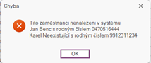 - Pokud není nalezen zaměstnanec s příslušným rodným číslem a pracovním poměrem, je to oznámeno.